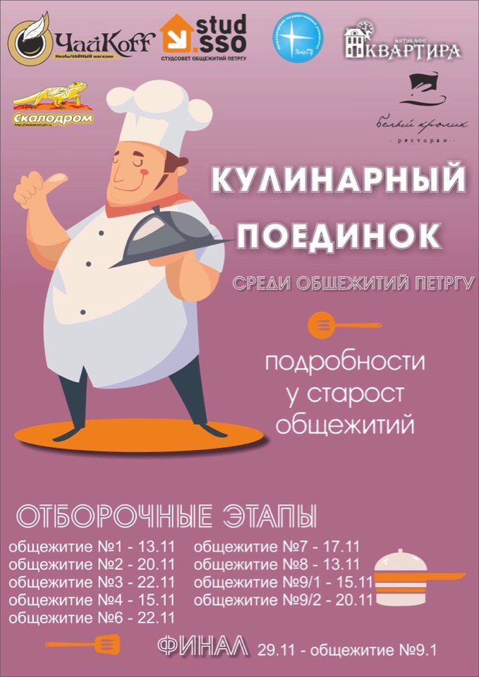 Уже сегодня в общежитиях начинаются отборочные этапы «Кулинарного поединка» Финал состоится 29 ноября! В этом году он будет особенно интересным Все подробности у старост общежитий!